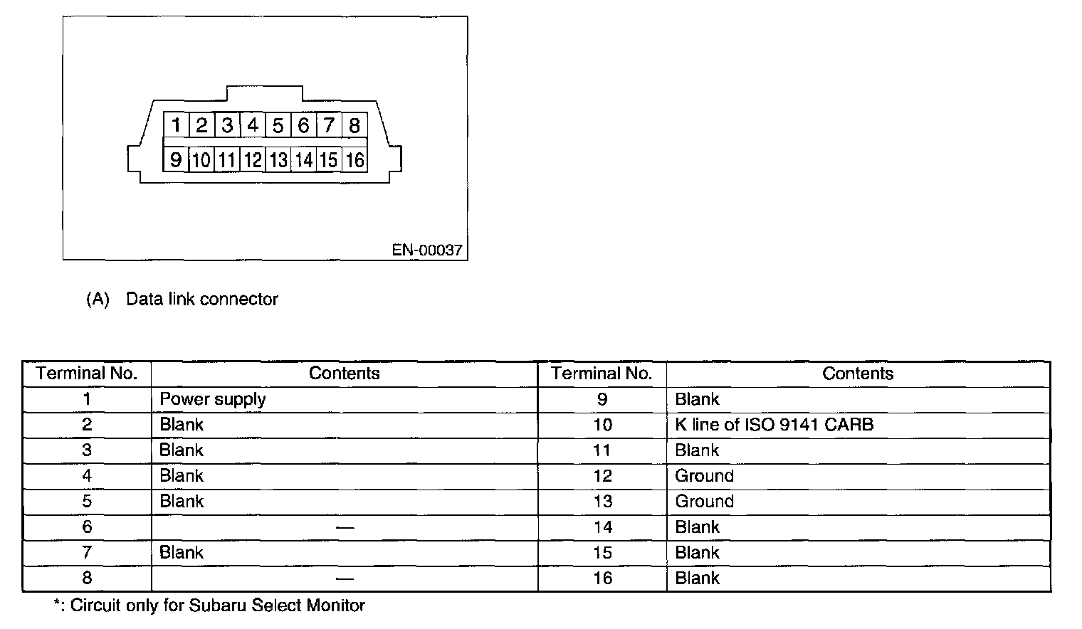 1. This connector is used both for OBD-II general scan tools and the Subaru Select Monitor.