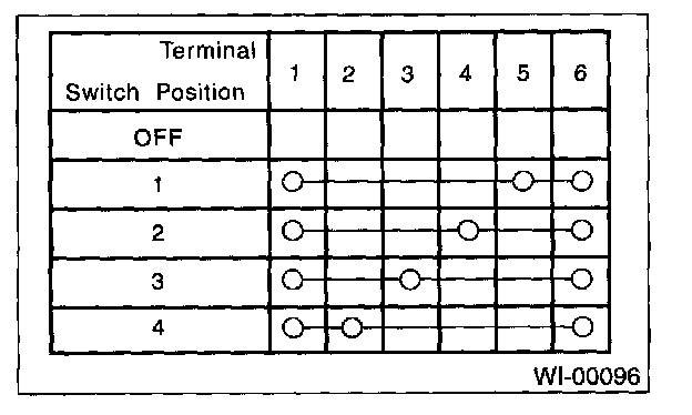 3. Symbol "O--O" indicates that continuity exists between two points or terminals. For example, when a switch position is "3", continuity exists among terminals 1, 3 and 6, as shown in table.