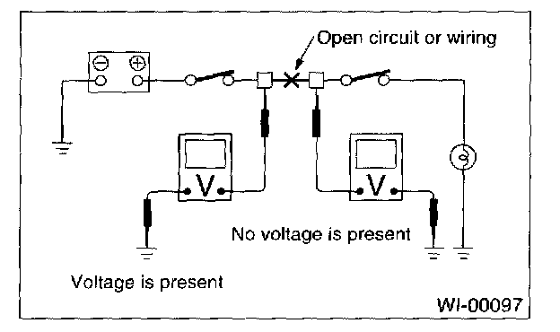 An open circuit is determined by measuring the voltage between respective connectors and ground using a voltmeter, starting with the connector closest to the power supply. The power supply must be turned ON so that current flows in the circuit. If voltage is not present between a particular connector and ground, the circuit between that connector and the previous connector is open.