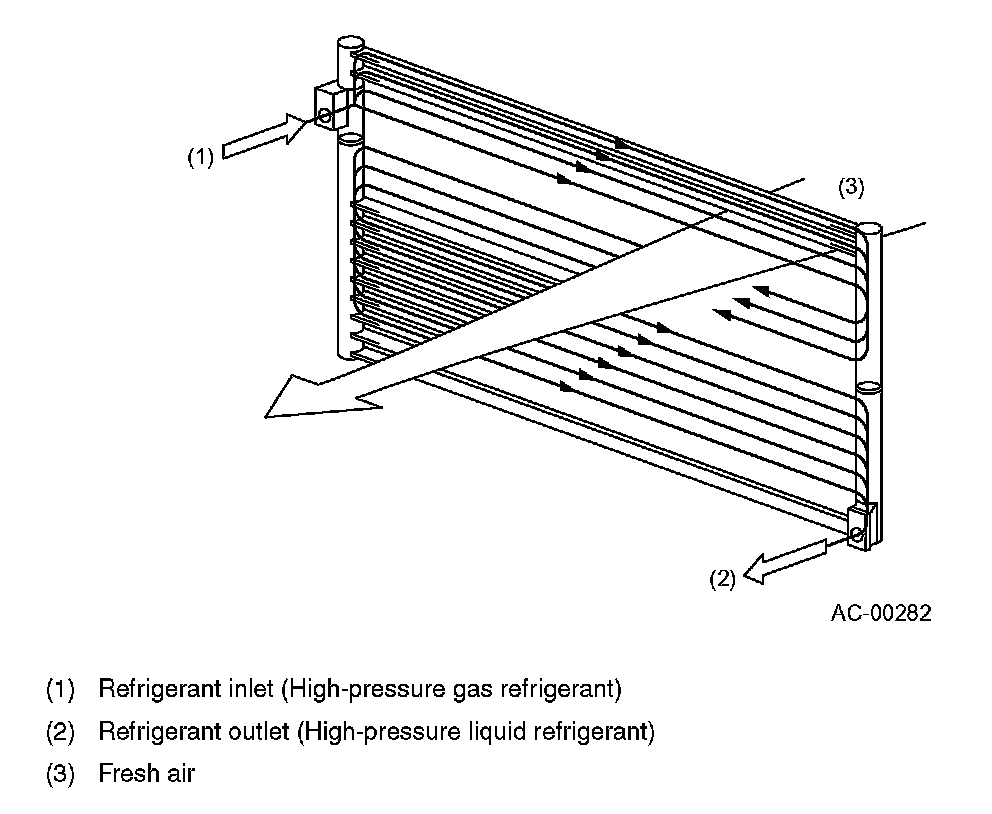 The heat of the refrigerant flowing through the condenser tubes is released into to the ambient air which is caused to flow across the fins by the cooling fan.
