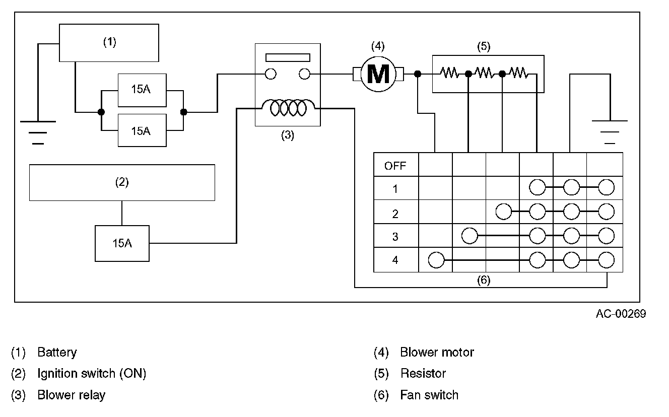 The blower relay is ready to be activated when the ignition switch is in the ON position. With the ignition switch ON, placing the fan switch in any position other than OFF activates the relay, allowing electric current to flow from the battery to the ground through the blower motor, the resistor, and the selected fan switch contacts. The connected resistor(s) vary depending on the selected position of the fan switch and cause the blower motor speed to change.