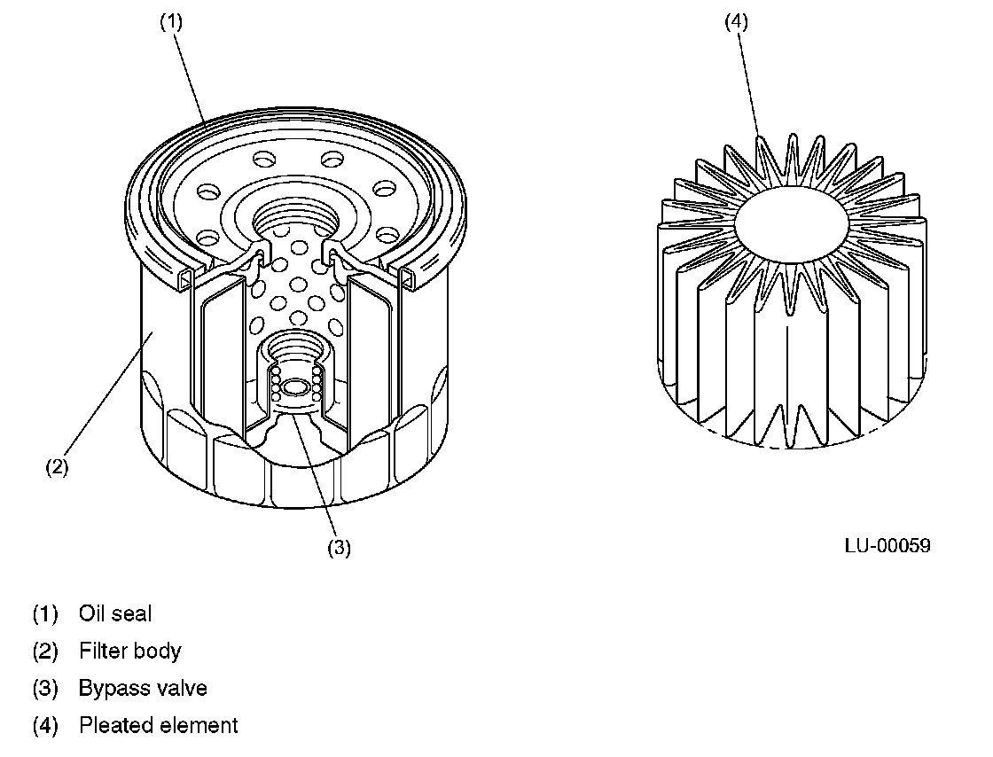 The oil filter is a full-flow filtering, cartridge type that utilizes a paper element. It also has a built-in bypass valve. The filter element has a special pleat design to increase the effective filtering area.