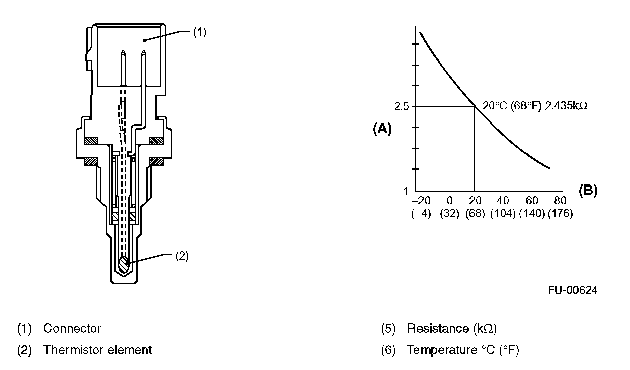 The engine coolant temperature sensor is located on the engine coolant pipe. The sensor uses a thermistor whose resistance changes inversely with temperature. Resistance signals as engine coolant temperature information are transmitted to the ECM to make fuel injection, ignition timing, purge control solenoid valve and other controls.