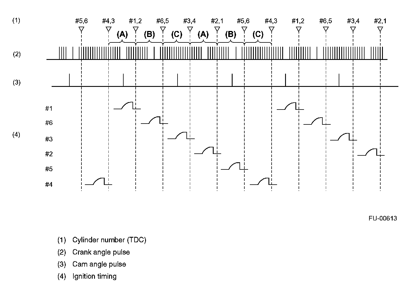 The ECM interprets the pulses of range (A) shown above as the No. 1 and No. 2 cylinder pistons being at TDC, the pulses of range (B) as the No. 5 and No. 6 cylinder pistons being at TDC, and the pulses of range (C) as the No. 3 and No. 4 cylinder pistons being at TDC.