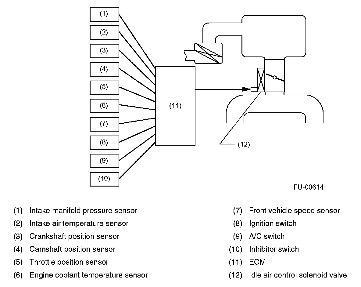 - The ECM activates the idle air control solenoid valve to control the bypass air flowing through the bypass passage in the throttle body depending on signals from the crankshaft position sensor, engine coolant temperature sensor, pressure sensor and A/C switch so that the proper idle speed for each engine load is achieved.