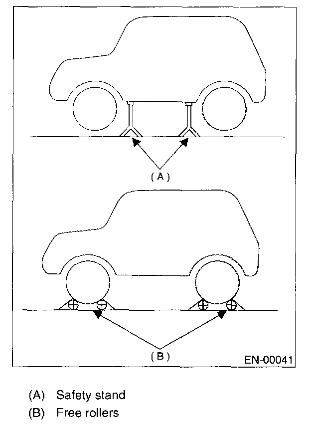 - In order to prevent the vehicle from slipping due to vibration, do not place any wooden blocks or similar items between the safety stands and the vehicle.