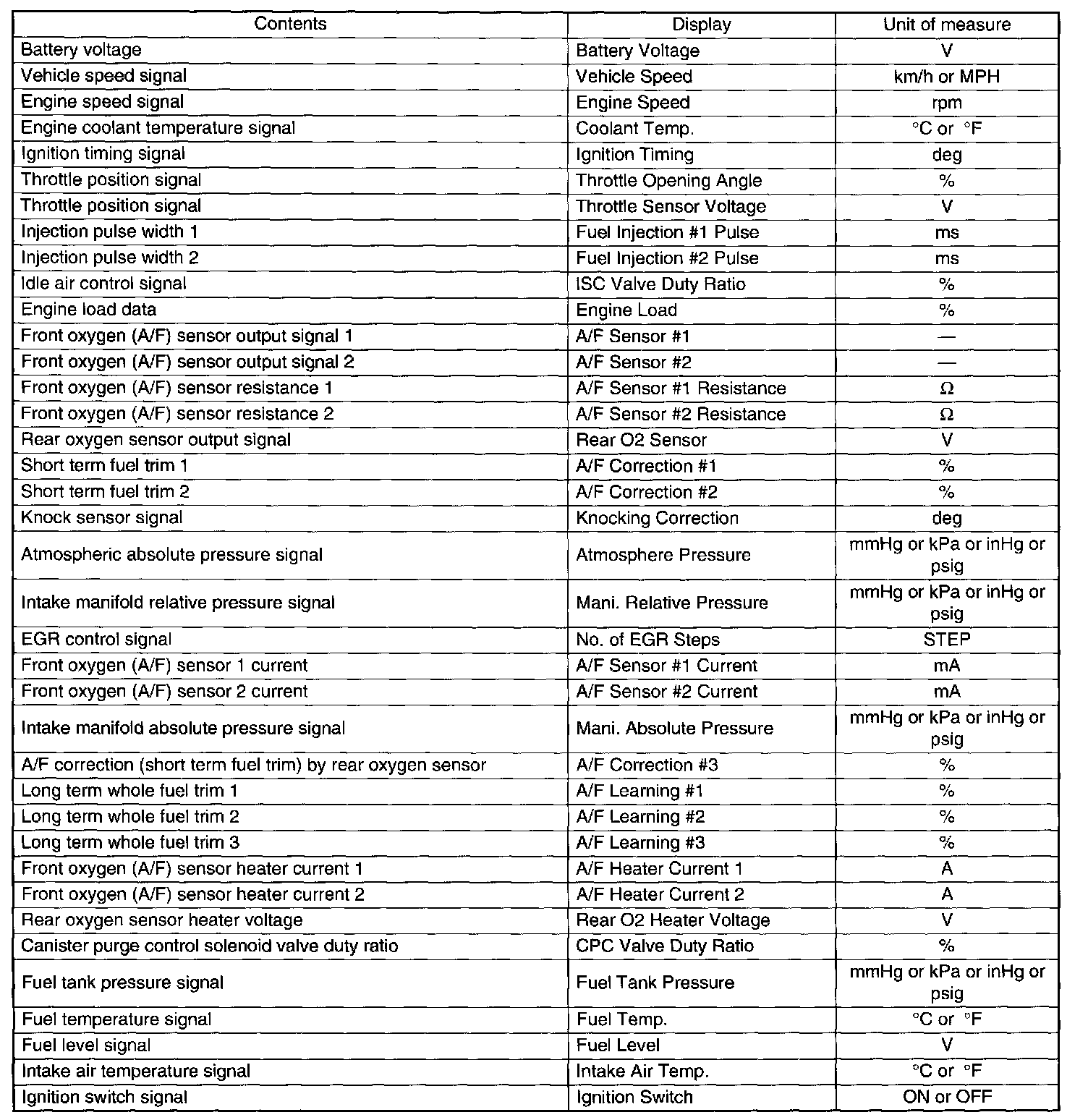 The signal which notifies whether or not torque down is possible is displayed. This signal is transmitted from the ECU in response to a torque down signal from the TCU. When torque down is prohibited, ON is displayed. When permitted, OFF is displayed.