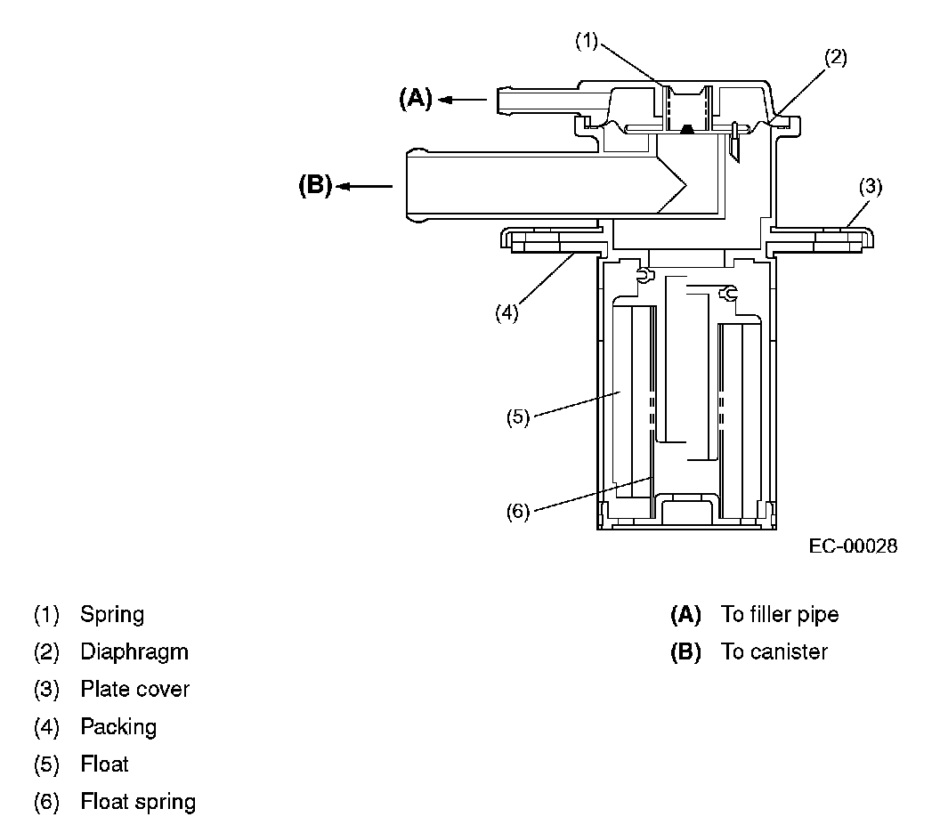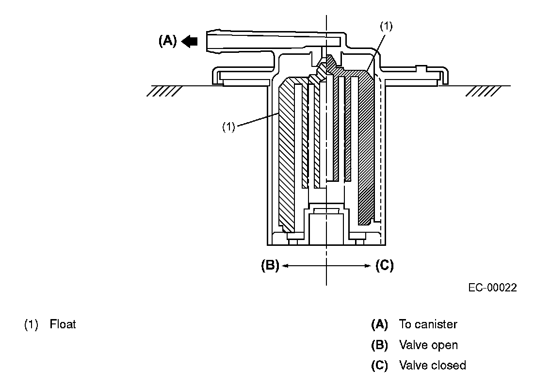 The fuel cut valve is built onto the evaporation pipe of the fuel tank cap. The rising level of the fuel in the fuel tank causes the float to move up and close the cap hole so that no fuel can flow to the evaporation line.
