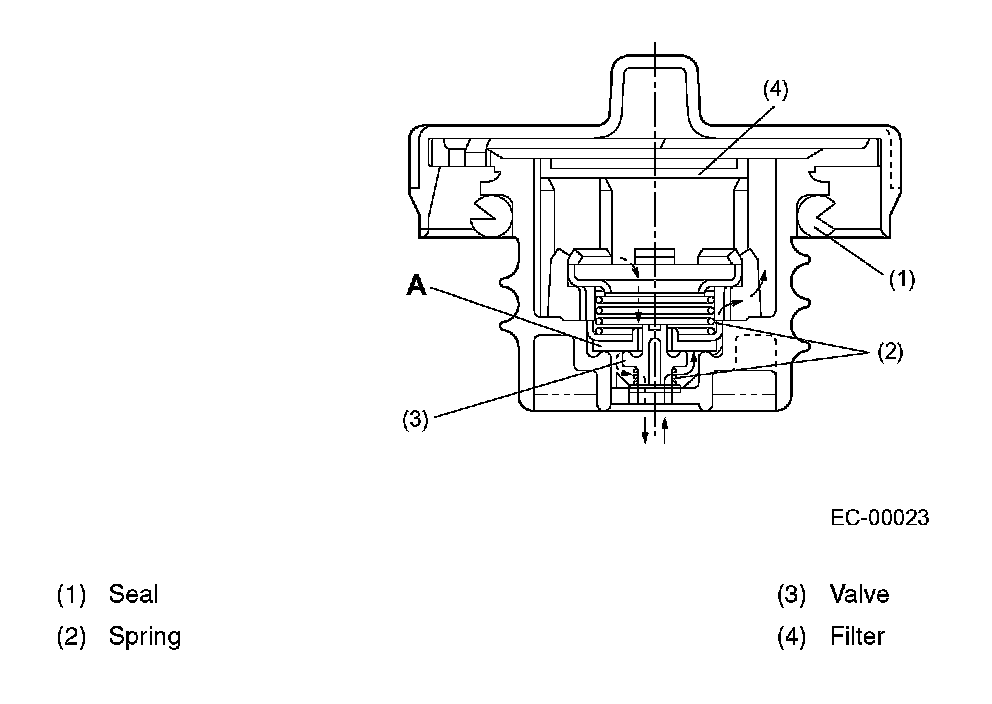 When there is no problem with the fuel vapor line, the filler pipe is sealed at the portion (A) and by the seal pressed against the filler pipe end. If vacuum develops in the fuel tank, the atmospheric pressure forces the spring down to open the valve; consequently outside air flows into the fuel tank, thus controlling the inside pressure.