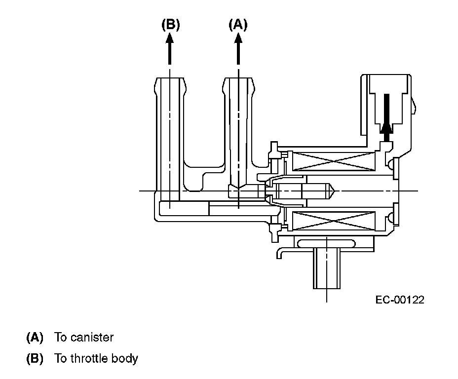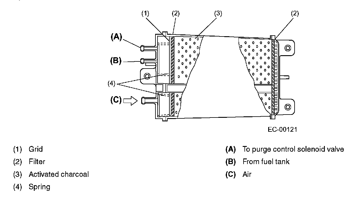 The charcoal filled in the canister temporarily stores fuel vapors. When the purge control solenoid valve is opened by a signal from the ECM, the external fresh air entering the canister carries the fuel vapors into the collector chamber.