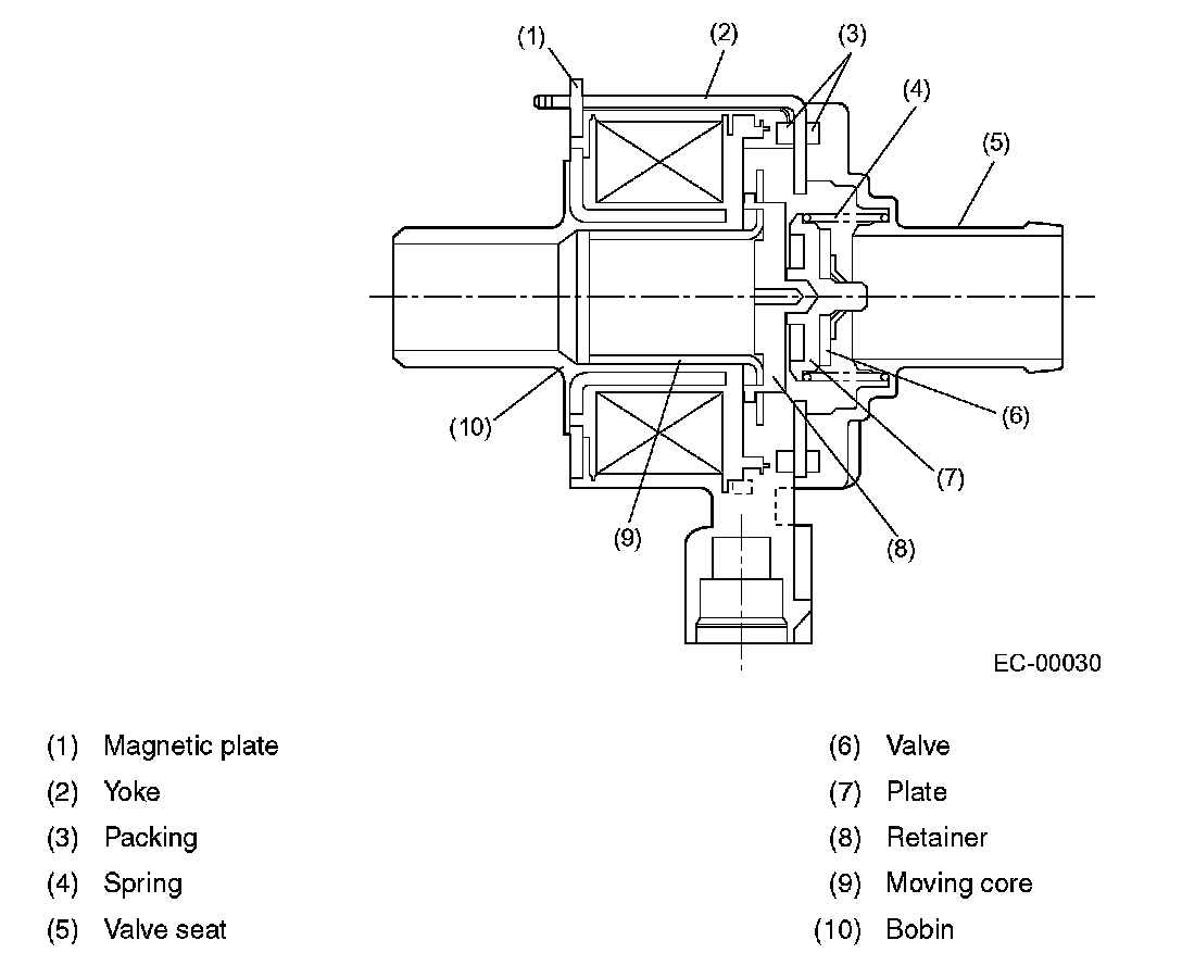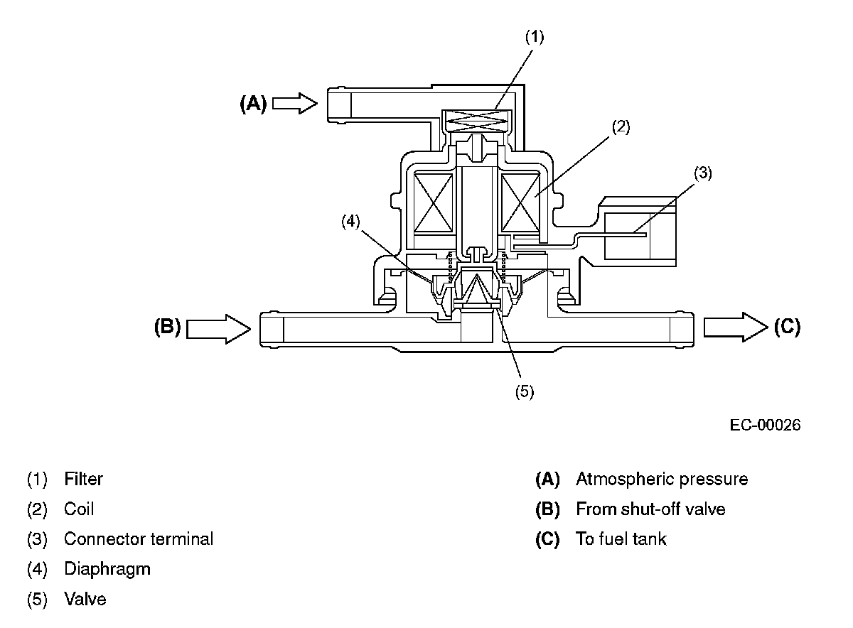 The fuel tank pressure control solenoid valve is located in the evaporation line between the shut-off valve on fuel filler pipe and the fuel tank. It adjusts the fuel tank inside pressure under the control of the ECM.