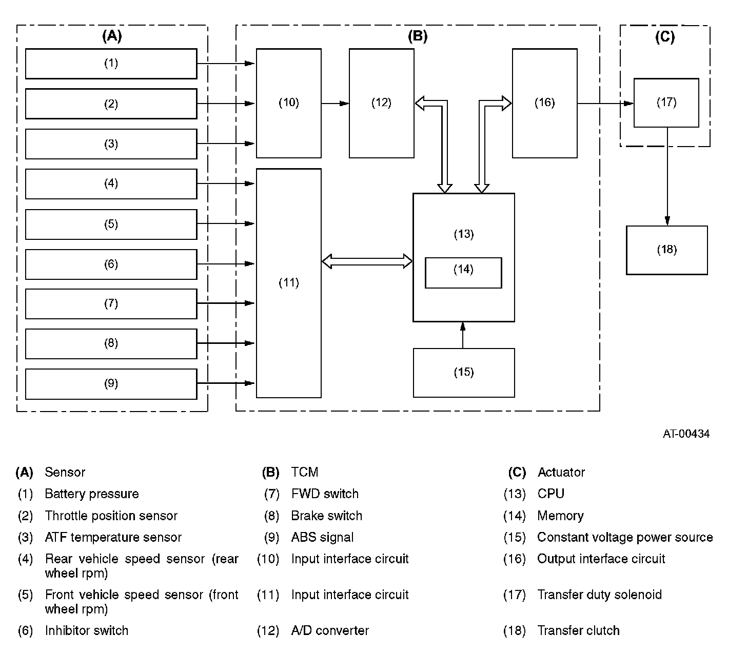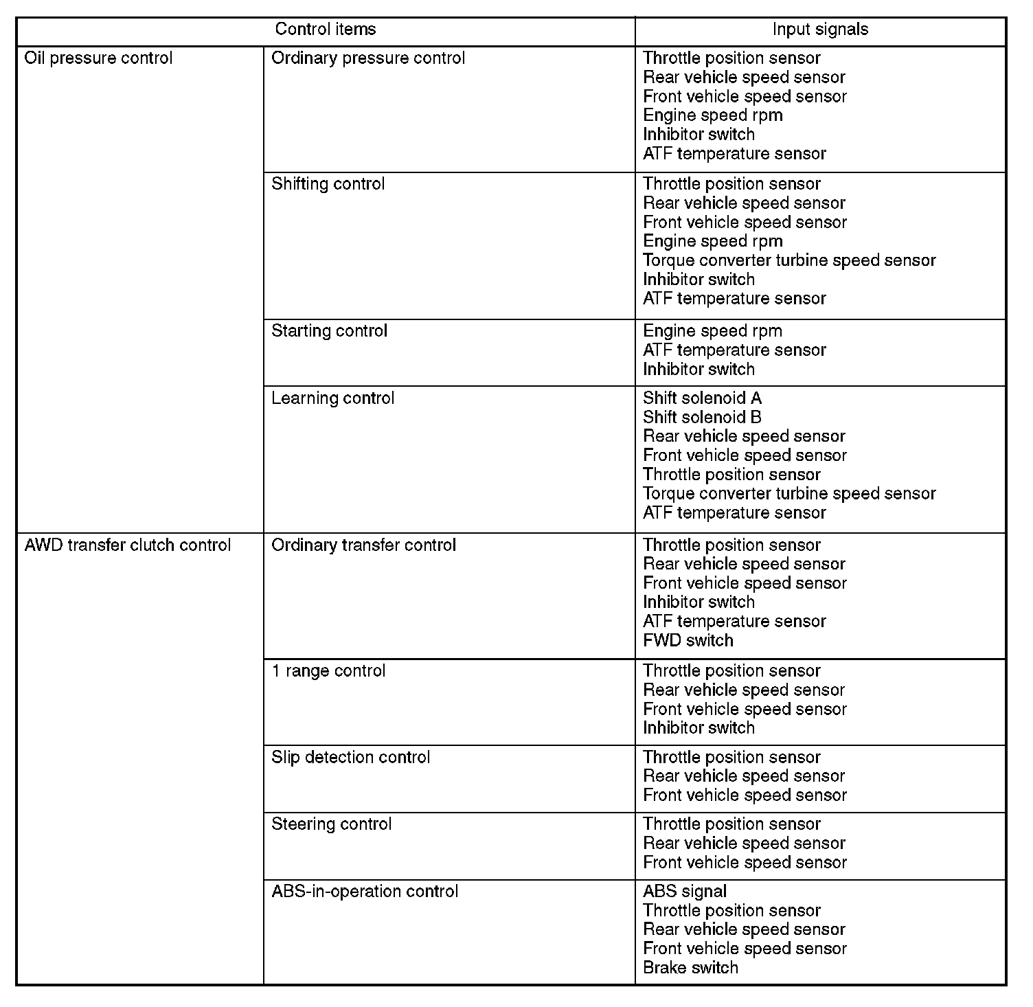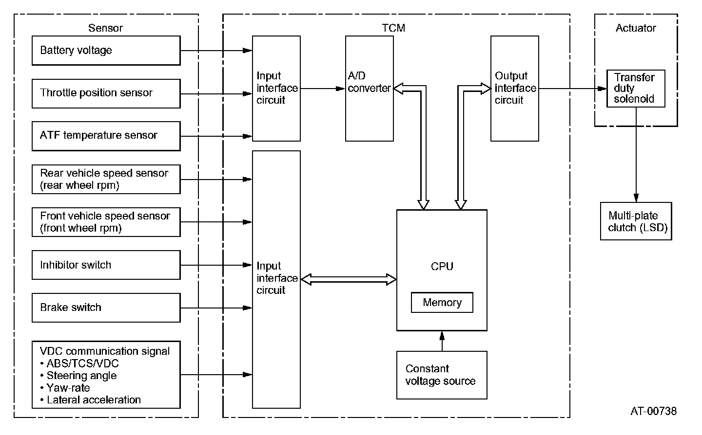 The TCM is constantly monitoring the driving conditions of the vehicle using the eleven input signals. Based on the conditions it has determined, the TCM adjusts the duty ratio of current to the transfer duty solenoid thus changing the engagement of the multi-plate clutch.The input signals are used also for automatic transmission control.