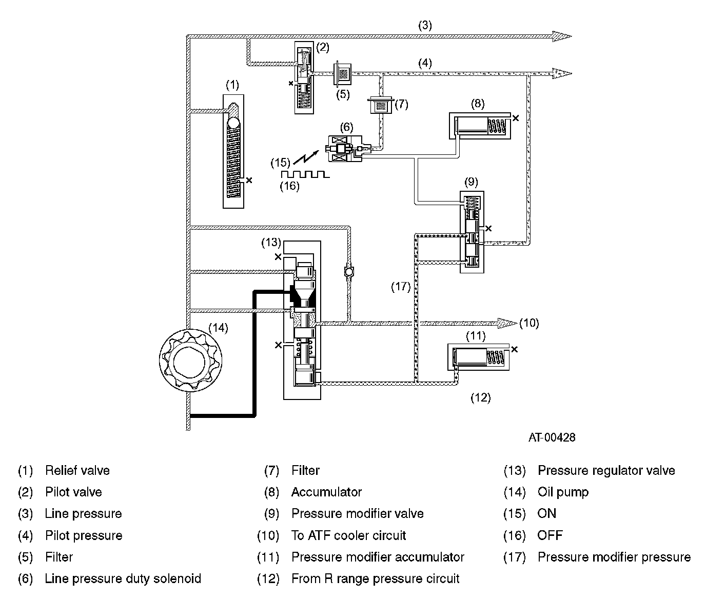 - The pilot pressure applied to the pressure modifier valve is modulated into pressure modifier pressure at the line pressure duty solenoid by activating the pressure modifier valve.