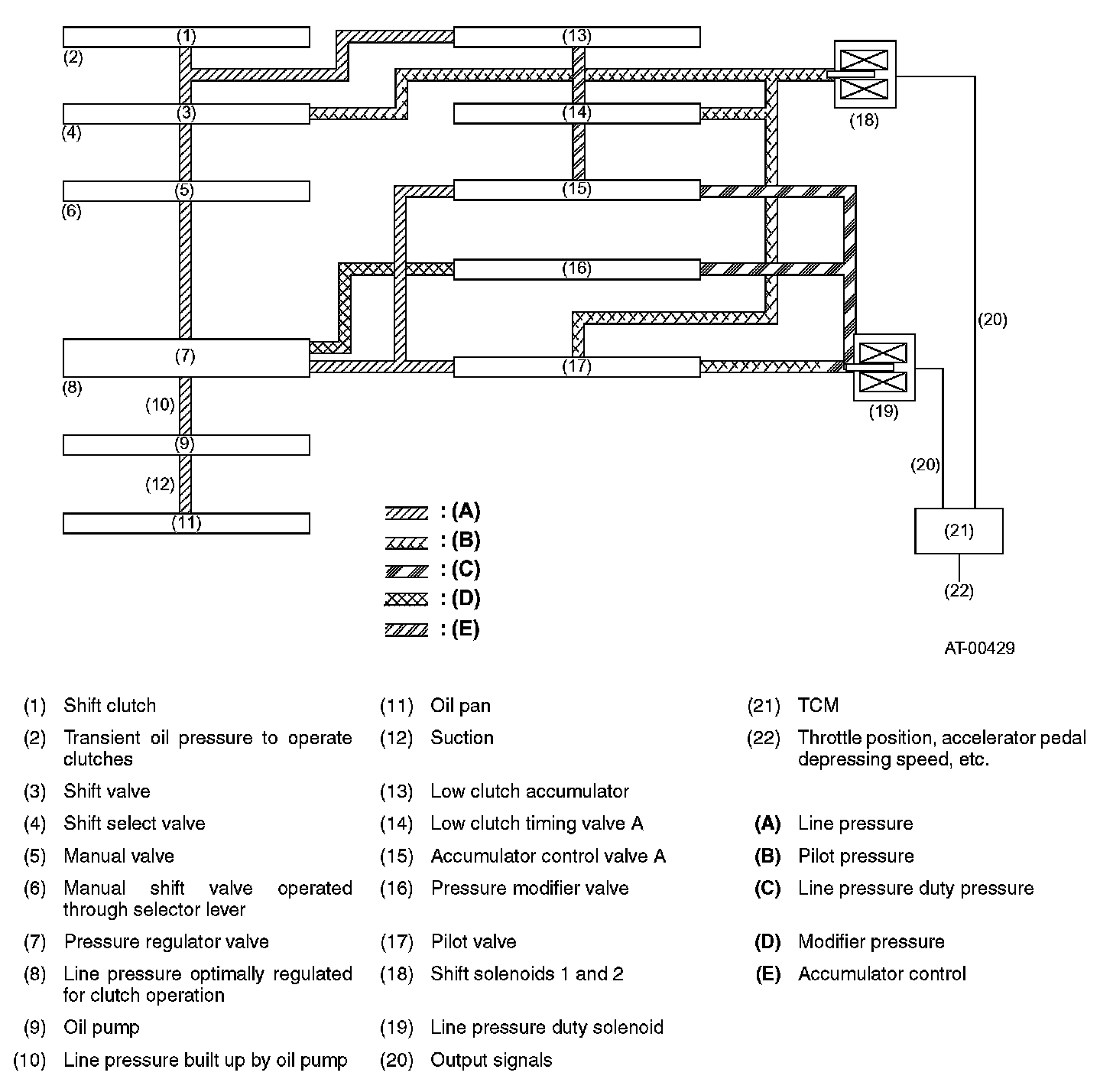 The line pressure which engages shift clutches to create 1st to 4th speeds is controlled by the TCM to meet varying operating conditions.
