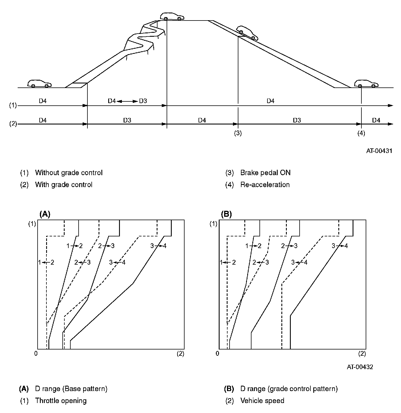 When the vehicle is descending a steep slope at a speed of approximately 80 km/h (50 MPH), a 4th to 3rd downshift occurs automatically when the brake pedal is depressed. This gearshift control is cancelled when the accelerator pedal is depressed.