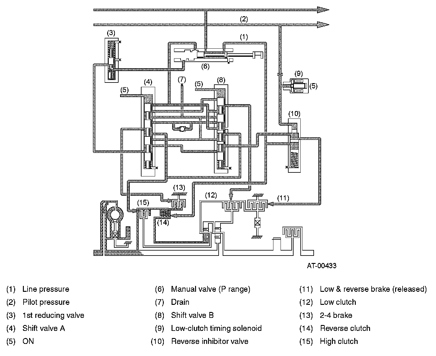 In this condition, the low & reverse brake does not engage since the ATF flowing from the manual valve is blocked by the reverse inhibitor valve.