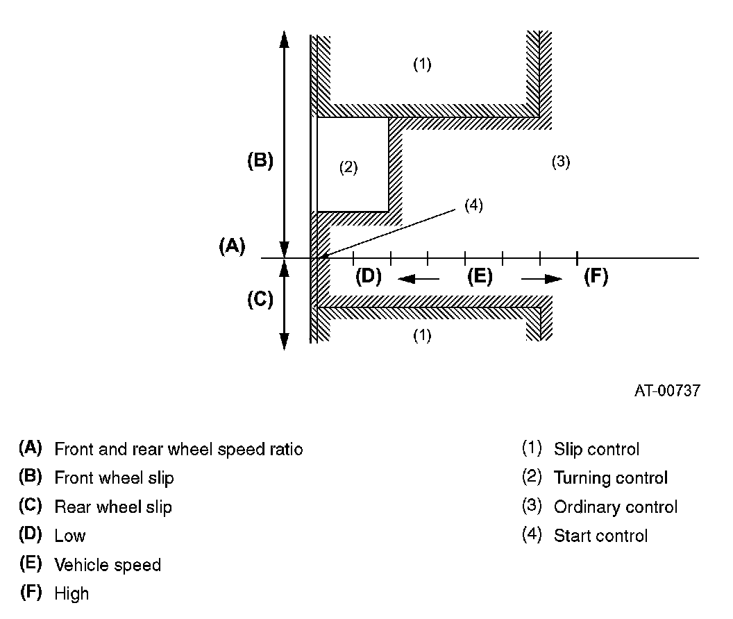When the vehicle speed is 0 km/h (0 MPH), the TCM makes control to generate differential action limiting torque that is proportional to the throttle angle.