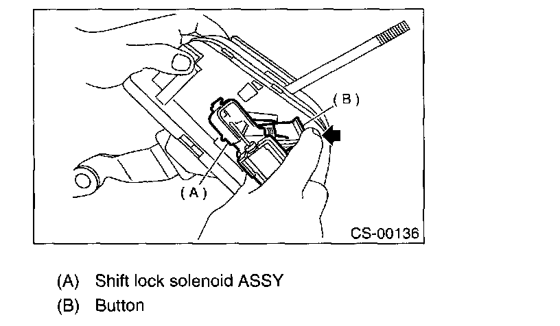 6. While pressing shift lock cancel button, remove shift lock solenoid assembly.