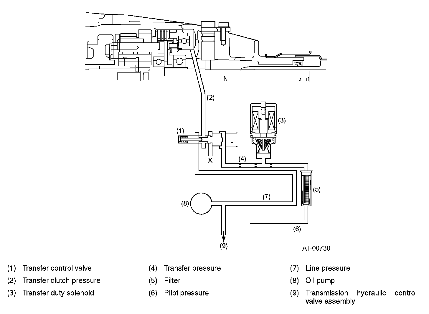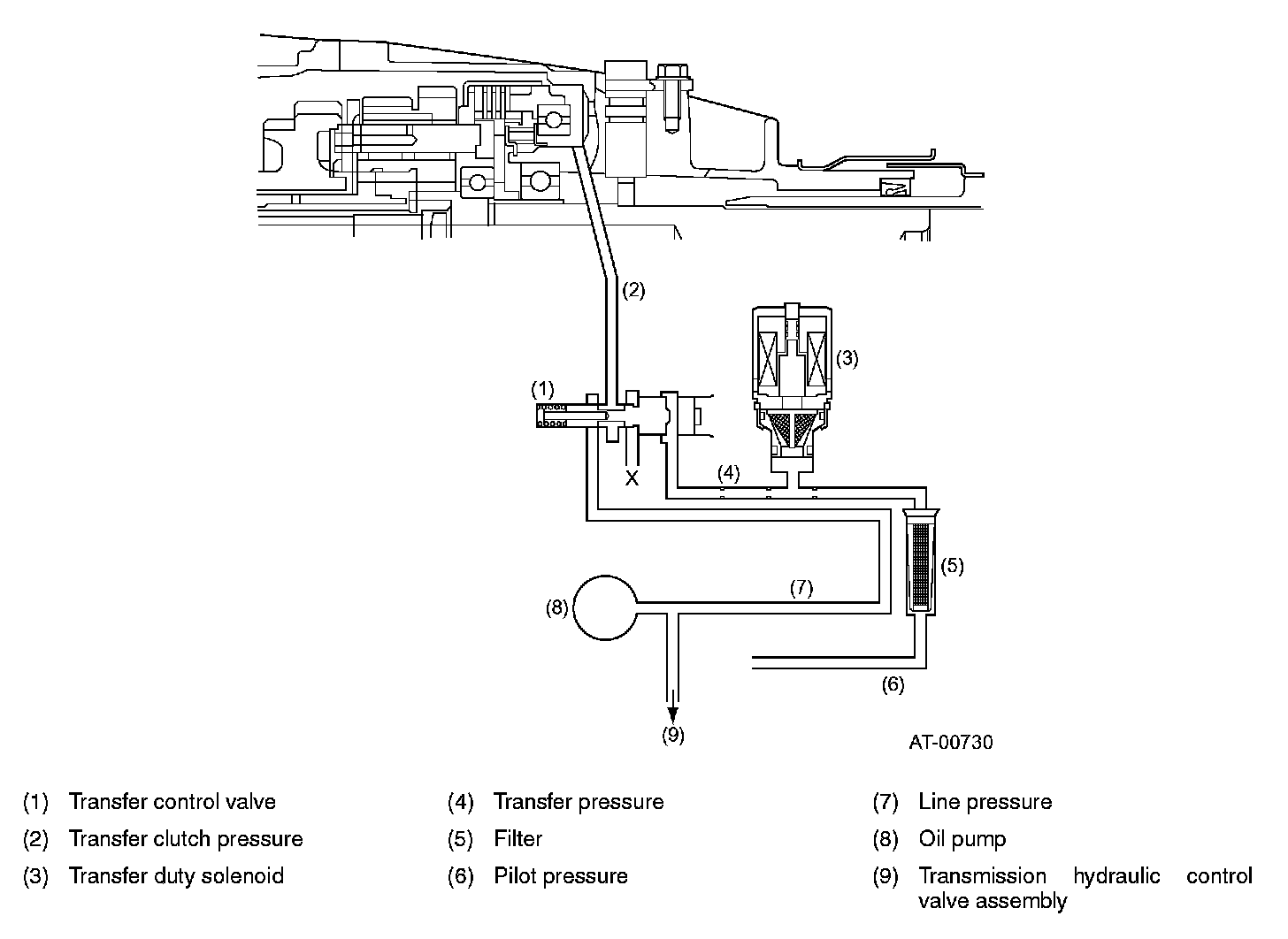 The hydraulic pressures used for the transfer hydraulic pressure control unit (line pressure and pilot pressure) are supplied from the transmission's hydraulic control valve assembly through the passages formed in the transmission case.