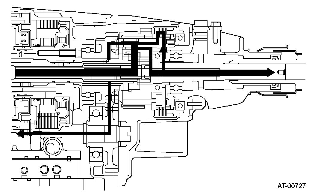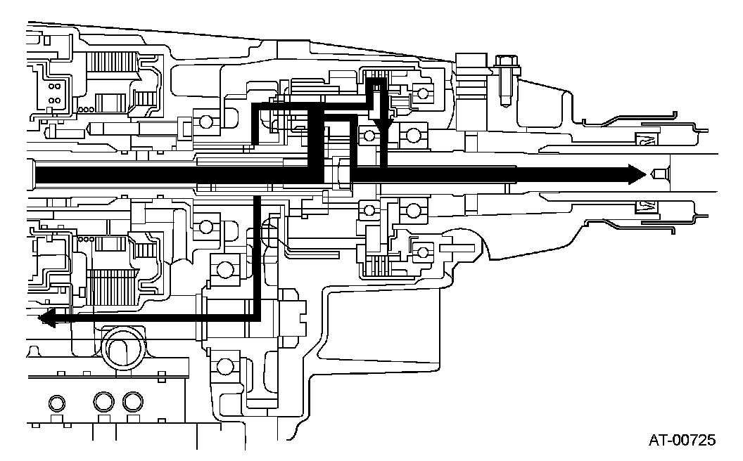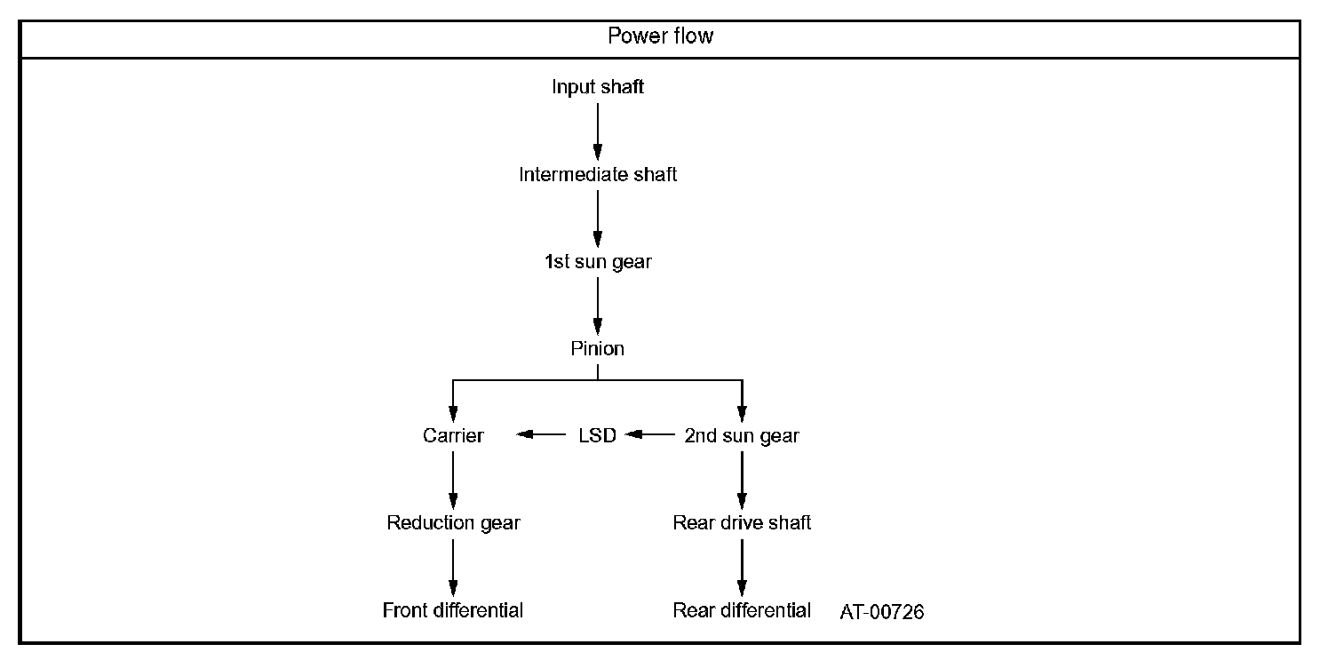 The input torque is transmitted to the 1st sun gear of the center differential through the intermediate shaft. From the 1st sun gear, the torque is transmitted through the 1st pinion to the output carrier in the front wheel output components, and through the 2nd pinion to the 2nd sun gear in the rear wheel output components.