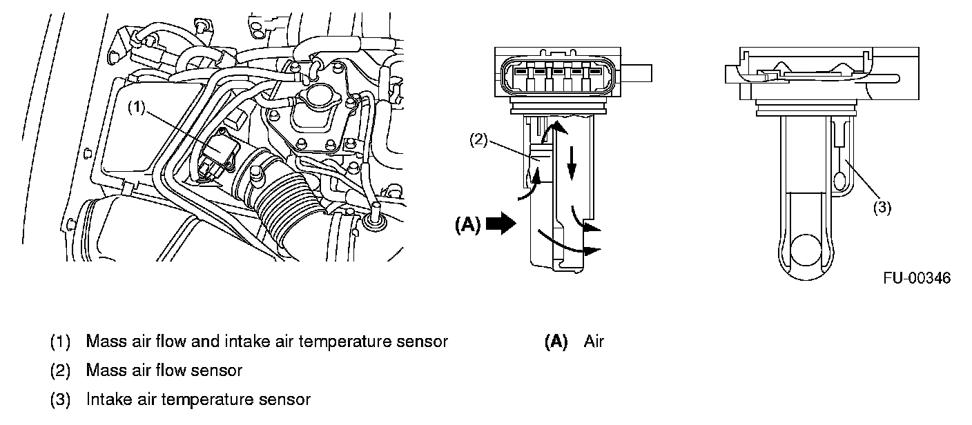 The mass air flow and the intake air temperature sensors are integrated into a single unit. The unit is mounted on the air cleaner case and measures the amount as well as the temperature of the intake air.