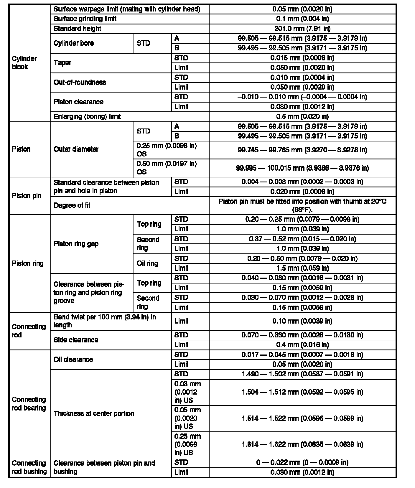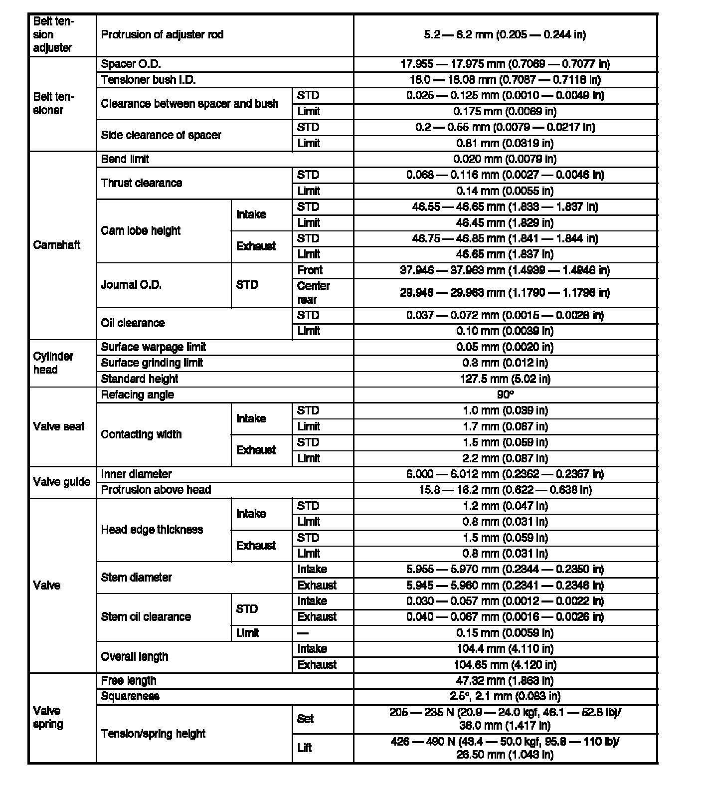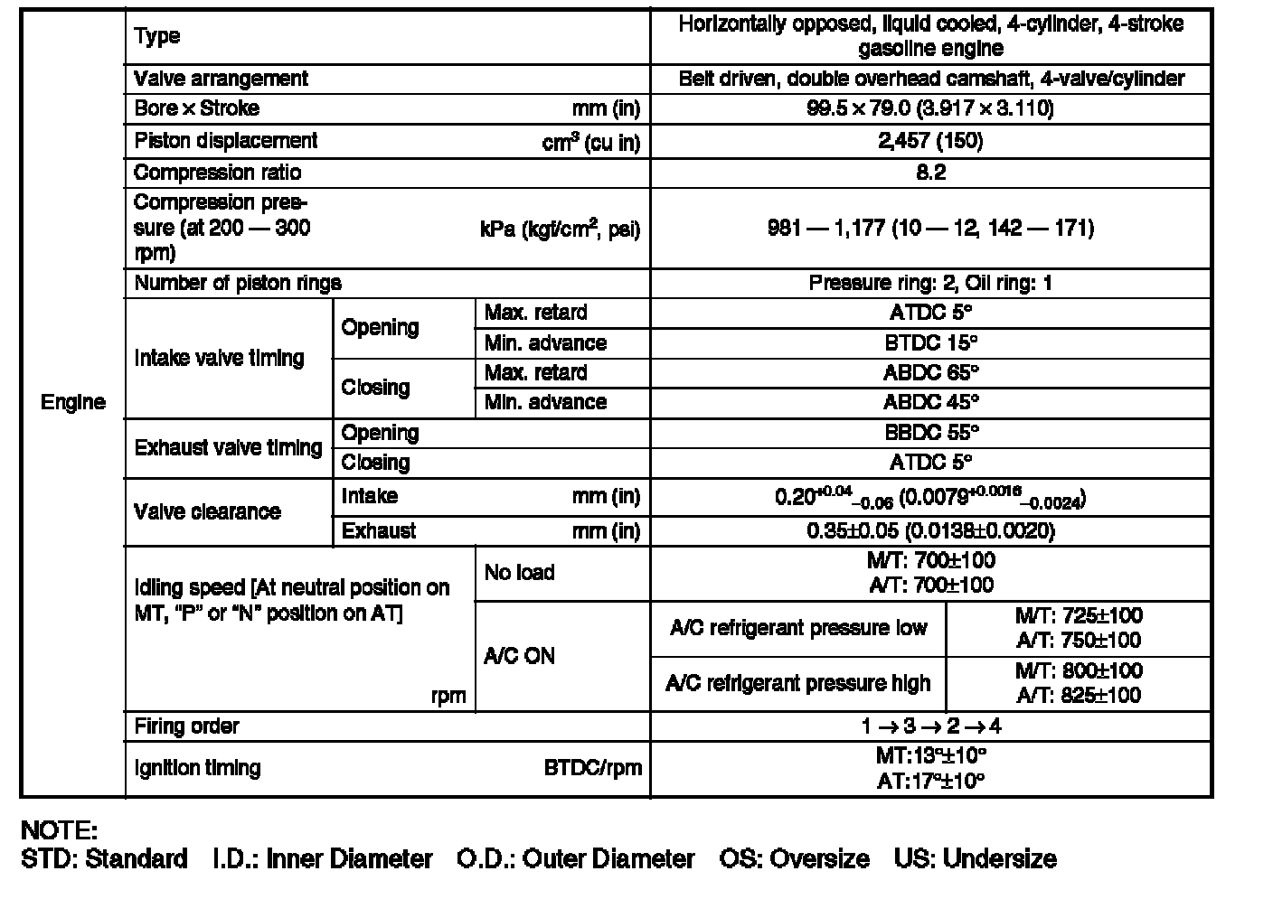 Engine specification tables