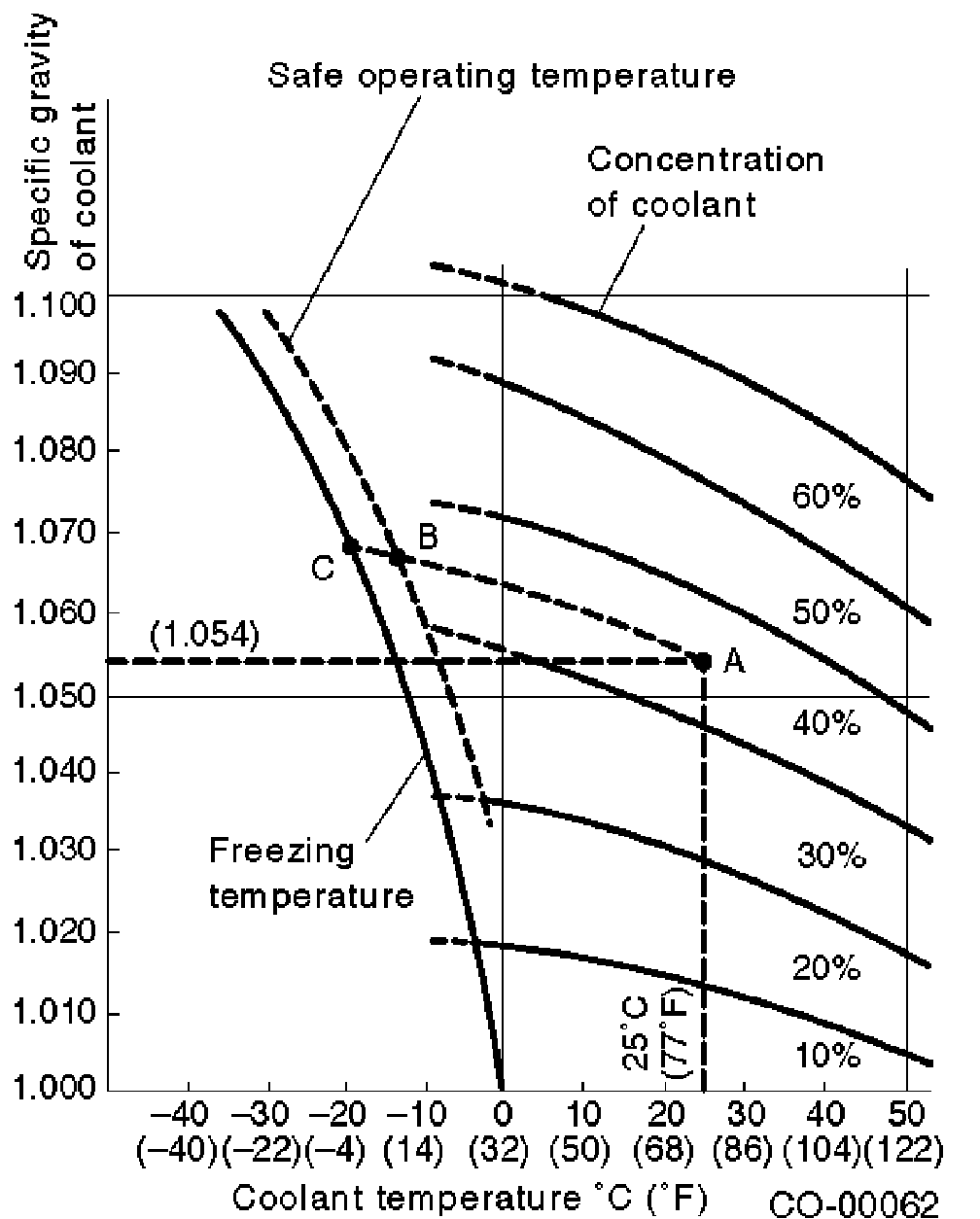 If the coolant temperature is 25°C (77°F) and its specific gravity is 1.054, the concentration is 45% (point A), the safe operating temperature is -14°C (7°F) (point B), and the freezing temperature is 20°C (-4°F) (point C).