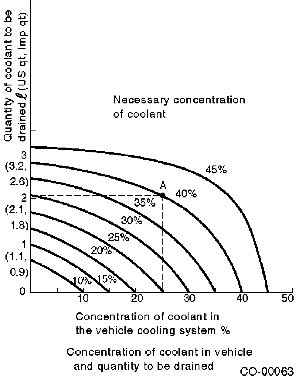 Assume that the coolant concentration must be increased from 25% to 40%. Find point A, where the 25% line of coolant concentration intersects with the 40% curve of the necessary coolant concentration, and read the scale on the vertical axis of the graph at height A. The quantity of coolant to be drained is 2.1 L (2.2 US qt, 1.8 Imp qt). Drain 2.1 L (2.2 US qt, 1.8 Imp qt) of coolant from the cooling system and add 2.1 L (2.2 US qt, 1.8 Imp qt) of the undiluted solution of SUBARU coolant.