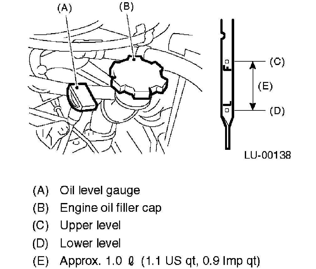 6. Just after driving or while the engine is warm, engine oil level may show in the range between the "F" line and notch mark. This is caused by thermal expansion of engine oil.