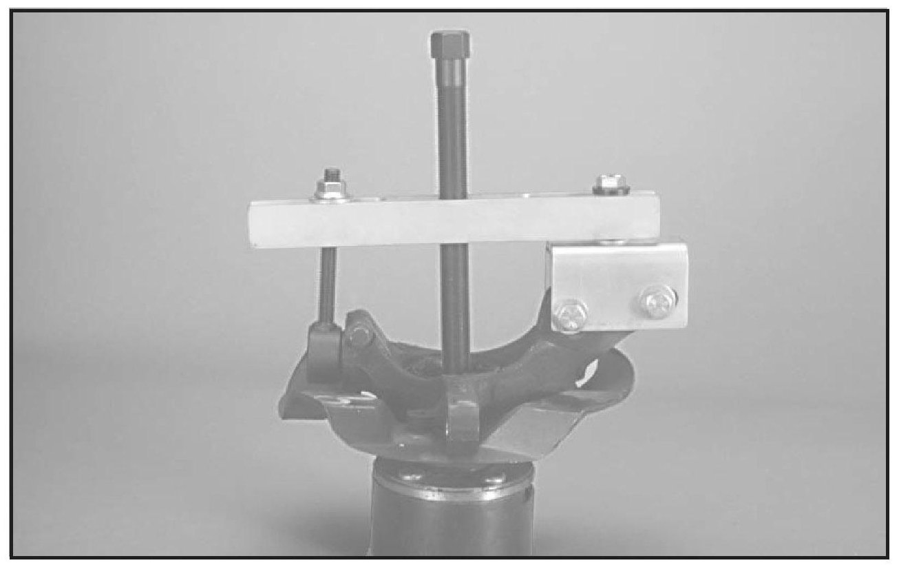 2. Place the hub into the press with press plates that will provide support to the under side of the inner race of the tapered roller bearing. Insert 28099PA040-6 onto the top of the hub. Apply pressure with the press until the hub is removed. Align press plate bolts so they are supported along the length of the bolt.