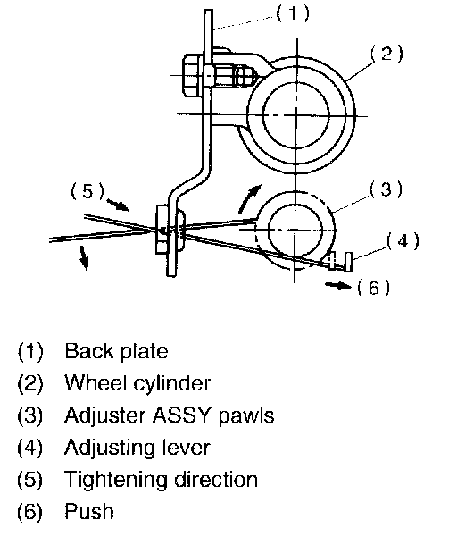 ^ If it is difficult to remove the brake drum, remove the adjusting hole cover from back plate, and then turn the adjuster assembly pawls using a flat tip screwdriver until brake shoe separates from drum.