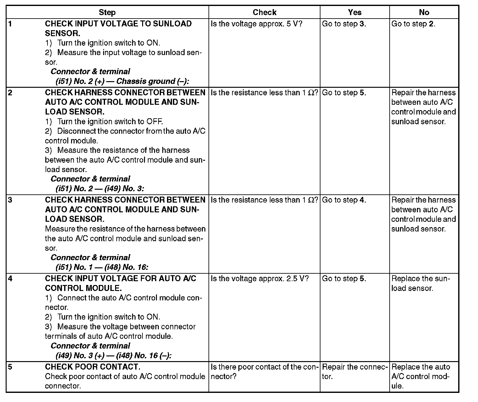 NOTE: When the sunload sensor is checked indoors or in the shade, an open circuit might be indicated. Always check the sunload sensor at a location exposed to direct sunlight.