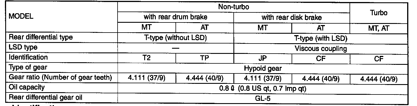 SPECIFICATIONSWhen replacing a rear differential assembly, select the correct one according to the following table.
