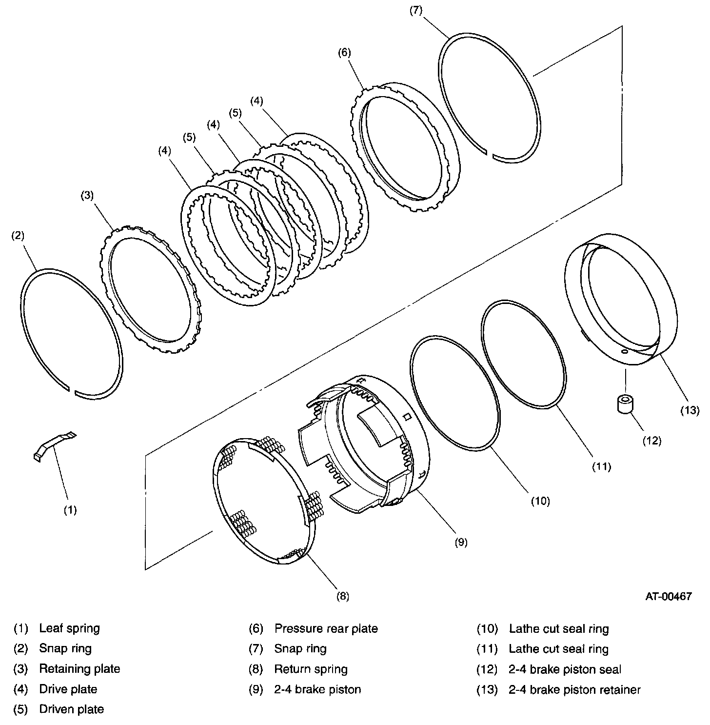 The 2-4 brake consists of a 2-4 brake piston, a return spring, a pressure plate, drive plates and driven plates.