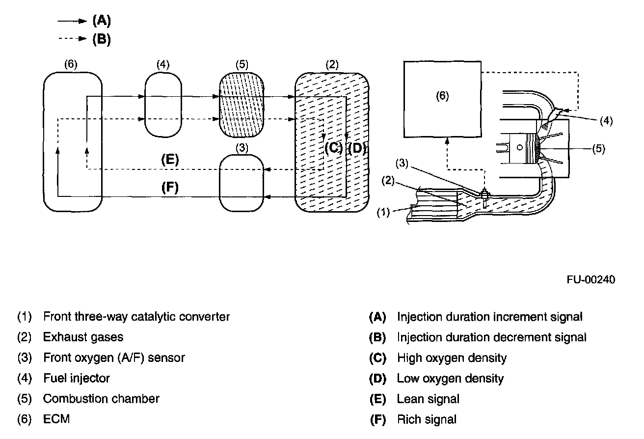 - In the air-fuel ratio feedback control, the ECM calculates the necessary amount of correction based on data from the oxygen sensor and adds the result to the basic duration (which is stored in the ECM's memory for each condition defined by the engine speed and various loads.)