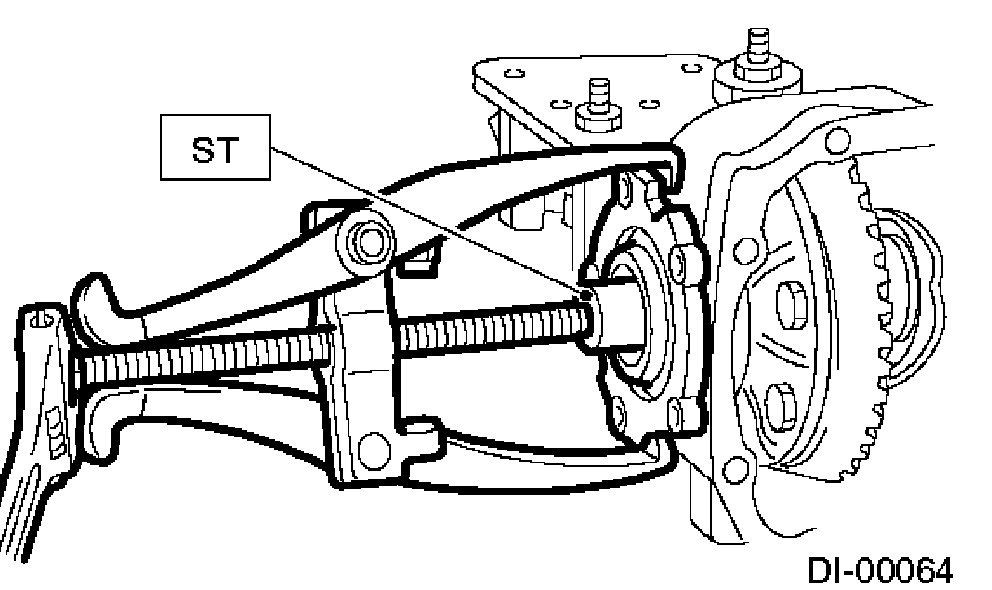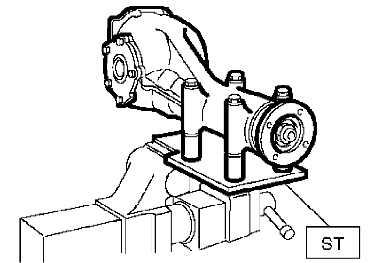 5. Make right and left side bearing retainers in order to identify them at reassembly. Remove the side bearing retainer attaching bolts, set the ST to differential case, and extract right and left side bearing retainers with a puller.