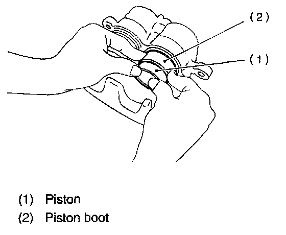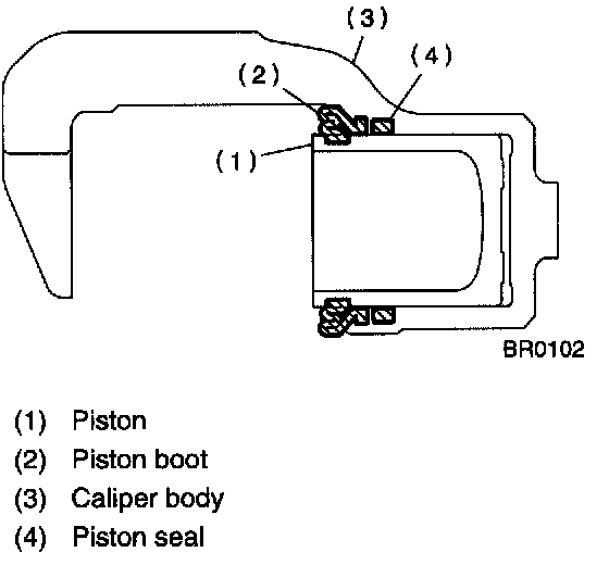 1) Check the caliper body and piston for uneven wear, damage or rust.
