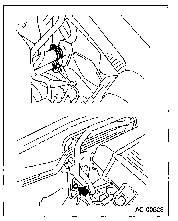 4. Remove the bolts securing expansion valve and pipe in engine compartment. Release the heater hose clamps in engine compartment to remove the hoses.