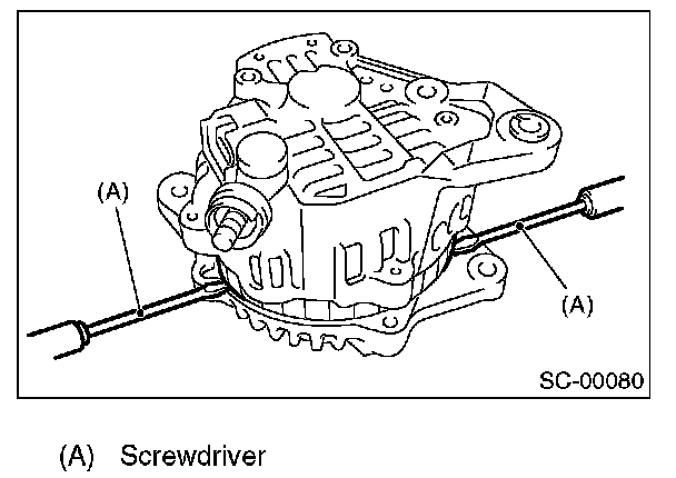 3. Then insert the tip of a flat tip screwdriver into the gap between stator core and front cover. Pry them apart to disassemble.