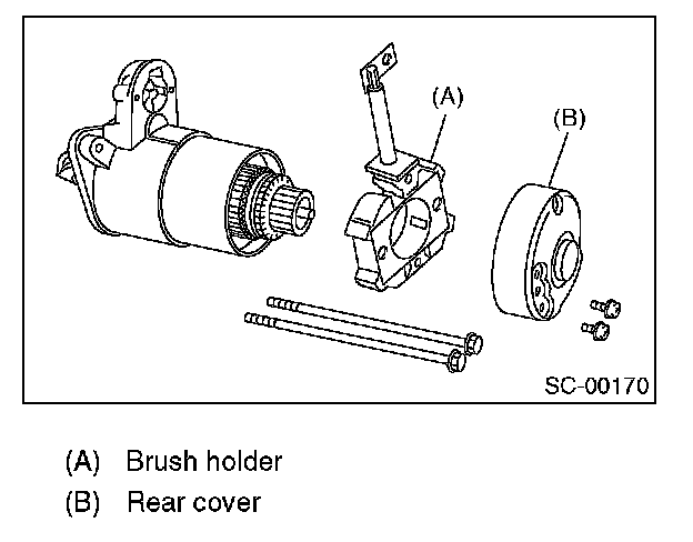 3. Remove both through-bolts and brush holder screws, and then detach the rear cover and brush holder.