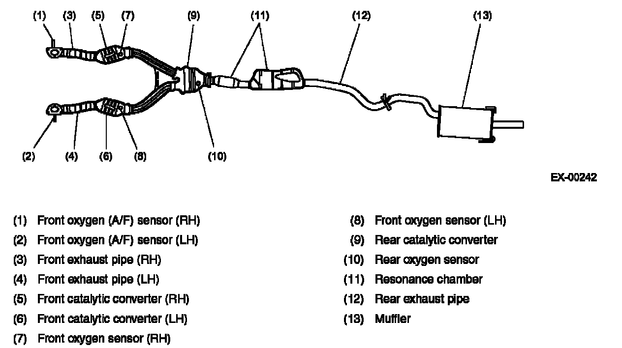 General^ The exhaust system consists of a front exhaust pipe assembly, a rear exhaust pipe with two resonance chambers, and a muffler. The front exhaust pipe assembly consists of right and left exhaust pipes each incorporating a front catalytic converter, and a rear catalytic converter that is located at the joint of the two pipes.