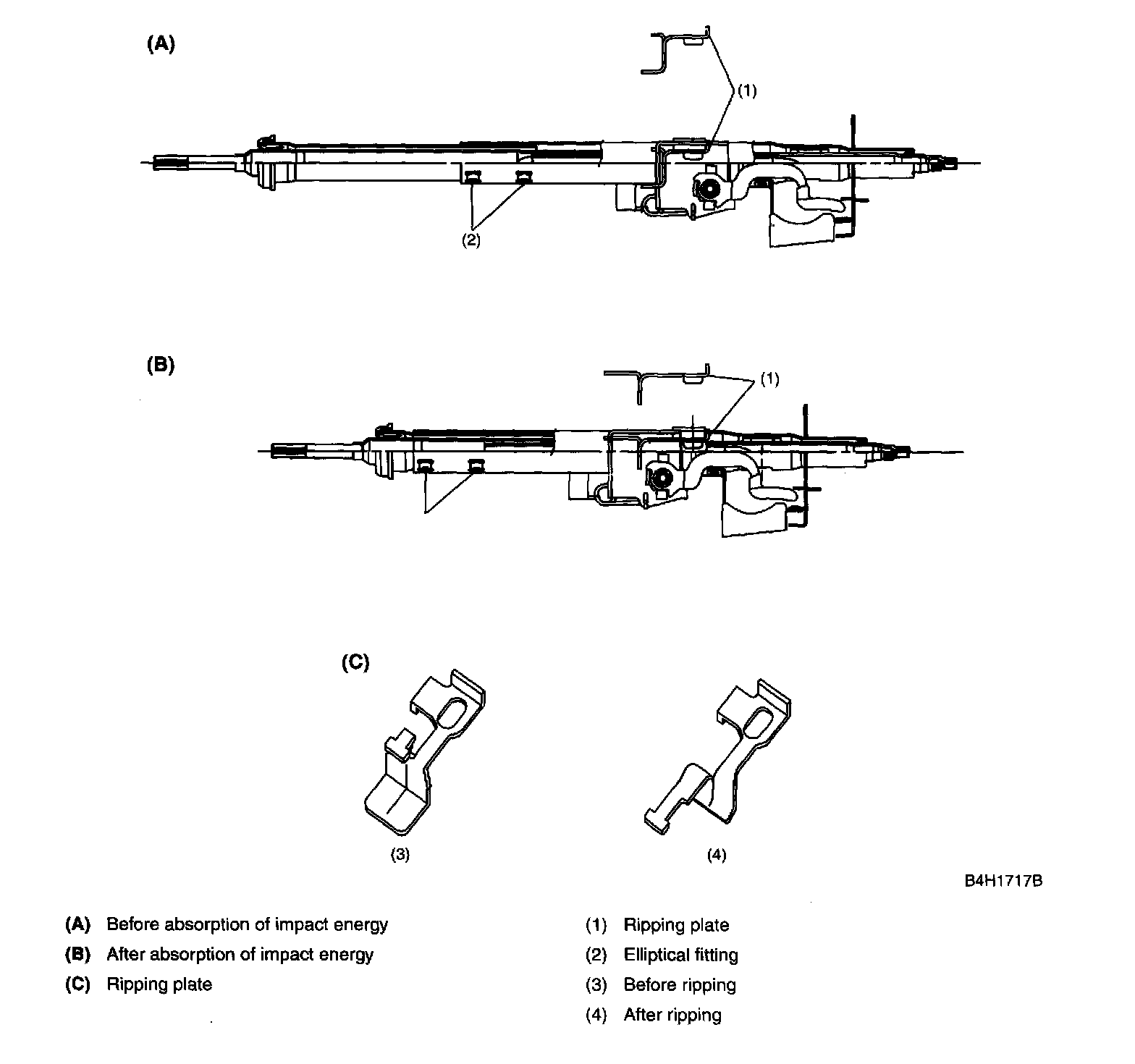 Another measure to alleviate impact on the driver in the event of a collision is the ripping plate, which is located between the steering column and the tilt bracket attached to the steering support beam. When a large impact load is applied to the steering column, the ripping plate is deformed and torn progressively. The impact energy is absorbed during this process.