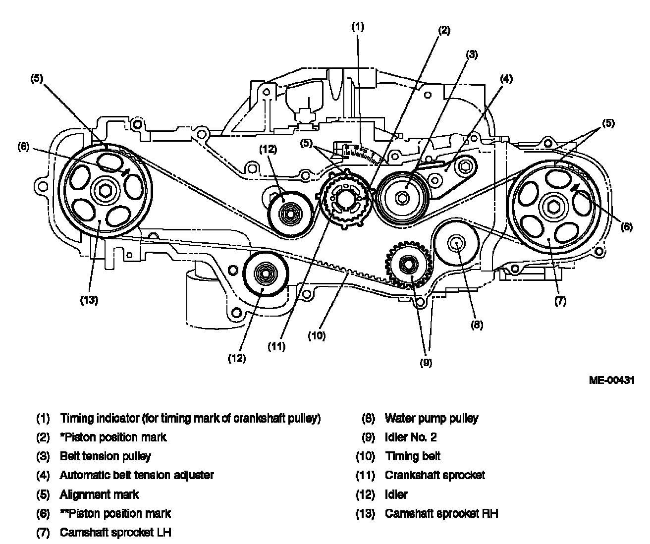 ^ The #1 piston is at TDC on the compression stroke when the piston position mark on the camshaft sprocket is aligned with the timing mark on the belt cover.