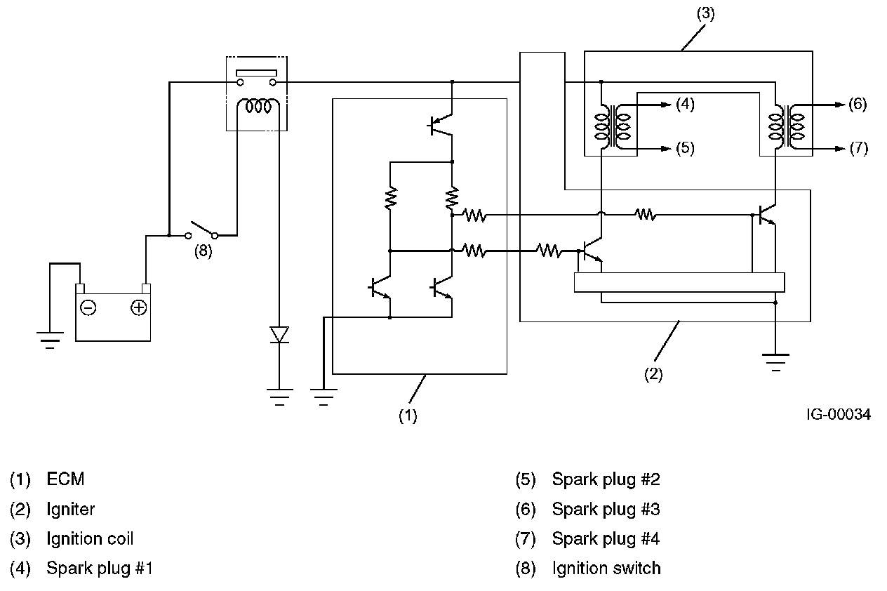 Ignition CoilIgnition coils are made integral with an igniter. The ignition system is of a dual-ignition-coil design, each coil causing two plugs to generate sparks simultaneously. In response to the signal from the ECM, the ignitor supplies current to an ignition coil and the ignition coil supplies high-voltage current to a pair of spark plugs (#1 and #2 or #3 and #4) simultaneously.