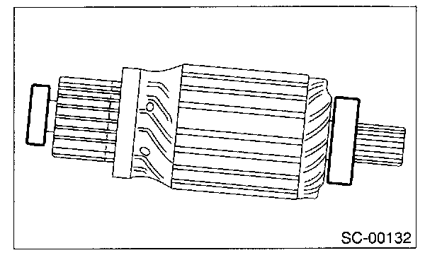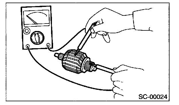 Using circuit tester, touch one probe to the commutator segment and the other to shaft. If there is no continuity, it is normal. If there is a continuity armature is grounded. Replace armature if it is grounded.