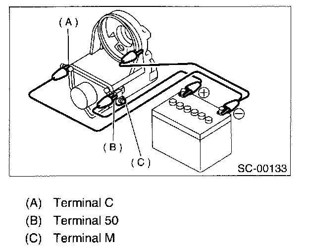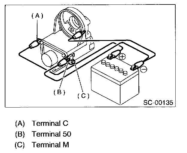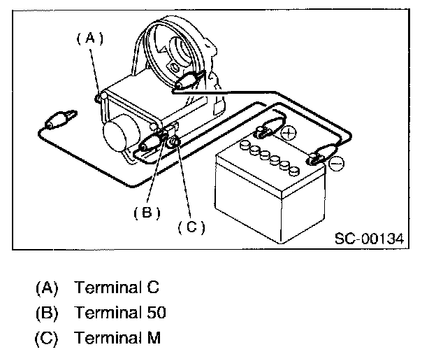 Connect two battery negative leads onto terminal 50 and onto terminal 50 and onto switch body respectively. Then connect battery positive lead onto terminal C. Next, disconnect lead from terminal 50. Pinion should return immediately.