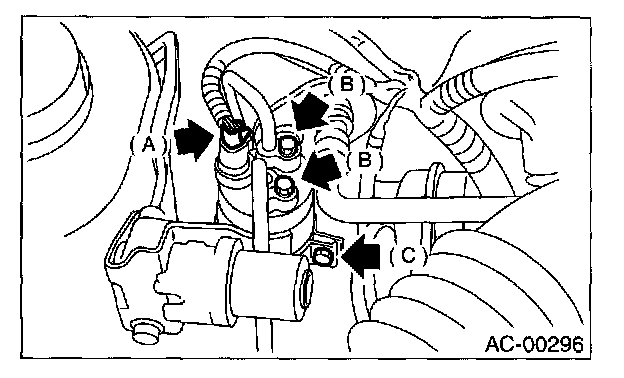5. Loosen mounting bolts (C) to remove receiver dryer.