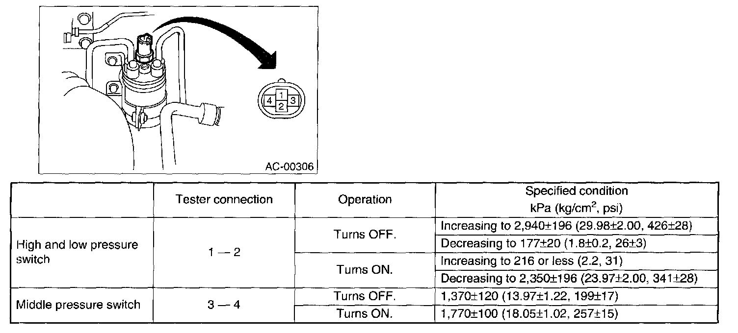 2. Remove the pressure switch harness connector. Using a circuit tester, inspect the ON-OFF operation of the pressure switch.