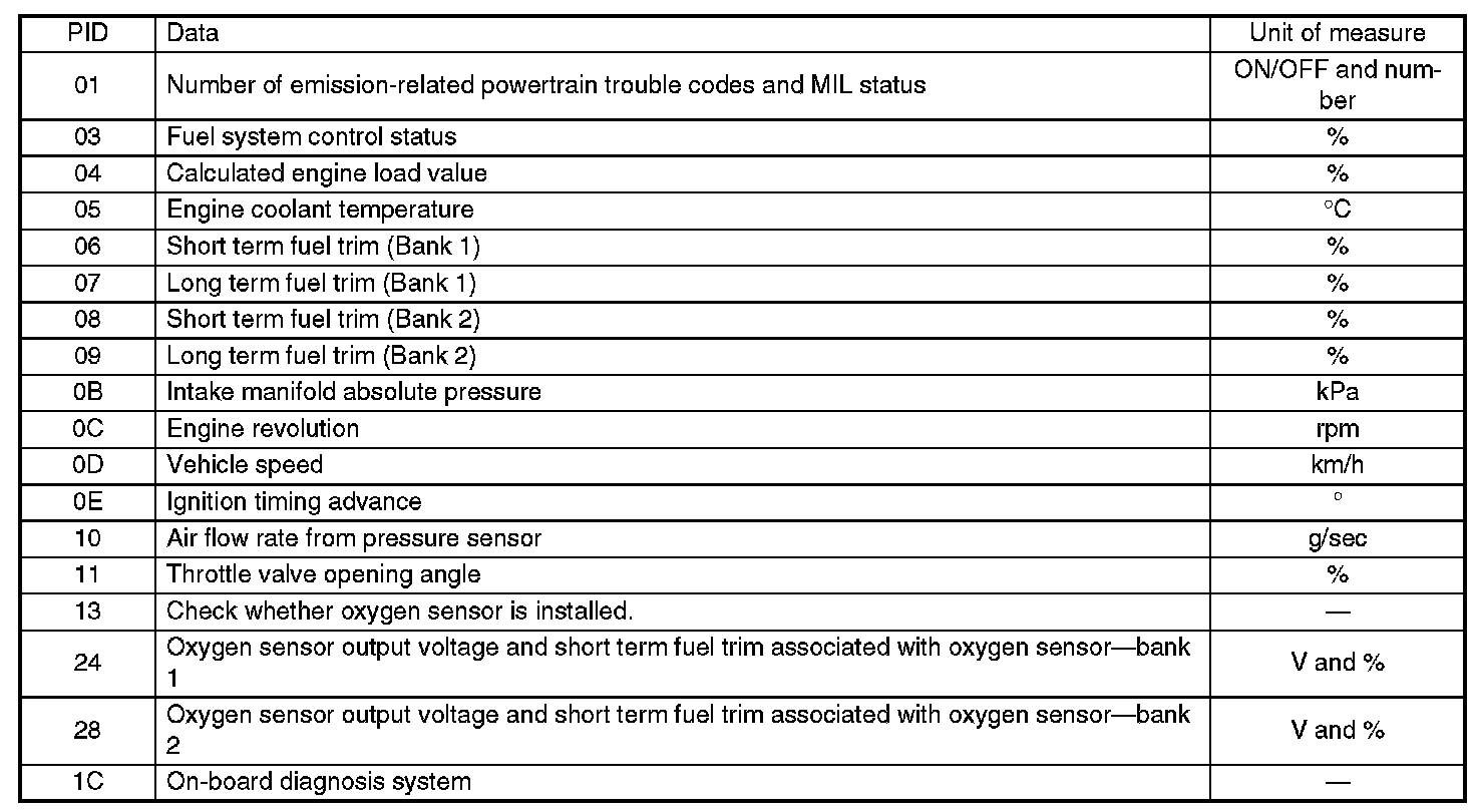 A list of the support data and PID (Parameter Identification) codes are shown in the table.