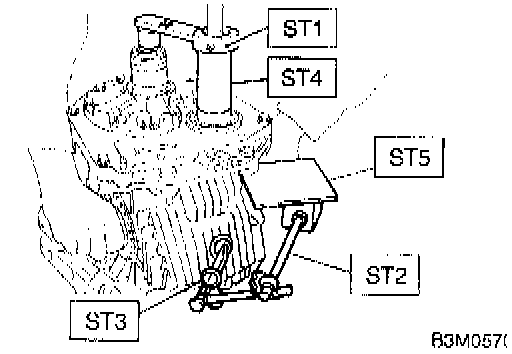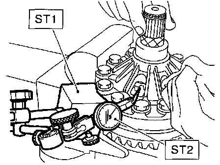 8. Turn the drive pinion several rotations with ST1 and check to see if the backlash is within the standard value with ST2, ST3, ST4 and ST5.